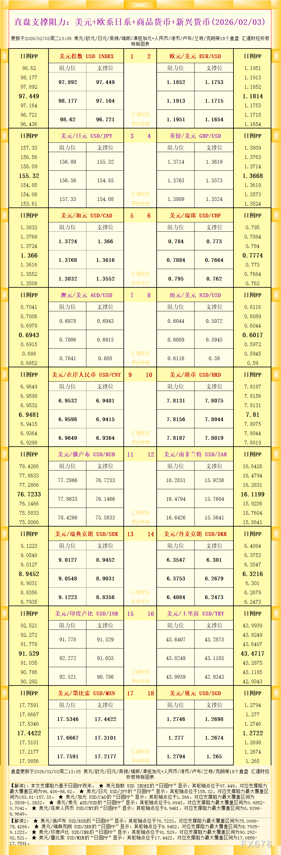 汇通财经APP讯——一张图看直盘支撑阻力:美元+欧系日系+商品货币+新兴货币,更新于2026年2月3日周二13:05,具体美元/欧元/日元/英镑/瑞郎/澳纽加元+人民币/港币/卢布/兰特/克朗等18个直盘,更多详见汇通财经析若特制图表中的内容。